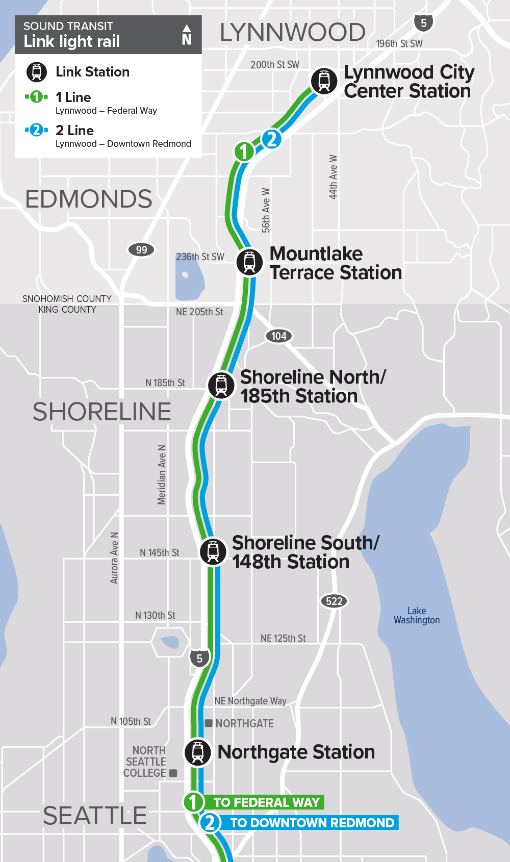 Sound Transit's Lynnwood Link Extension offers four light rail stations North of Northgate Station in Lynnwood, Mountlake Terrace, and Shoreline, making for faster local and regional connections.