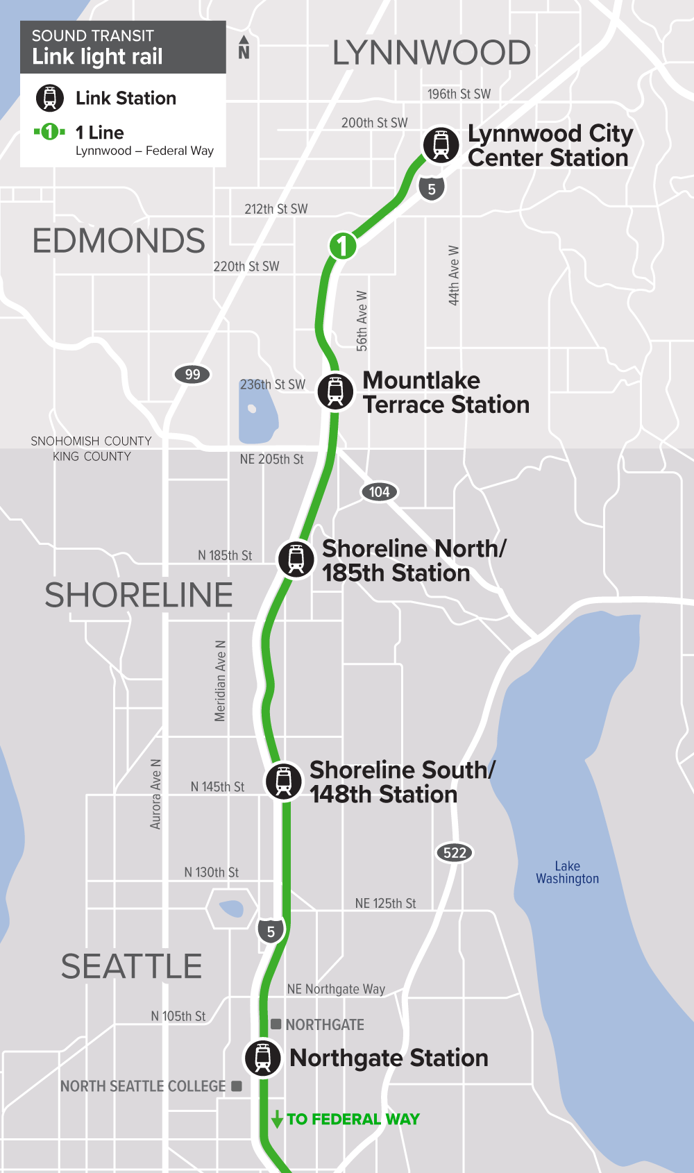 Sound Transit's Lynnwood Link Extension offers four light rail stations North of Northgate Station. Community Transit's many services can make catching the train at Lynnwood, Mountlake Terrace, and Shoreline easy and light rail makes for faster local and regional connections for anyone taking transit.