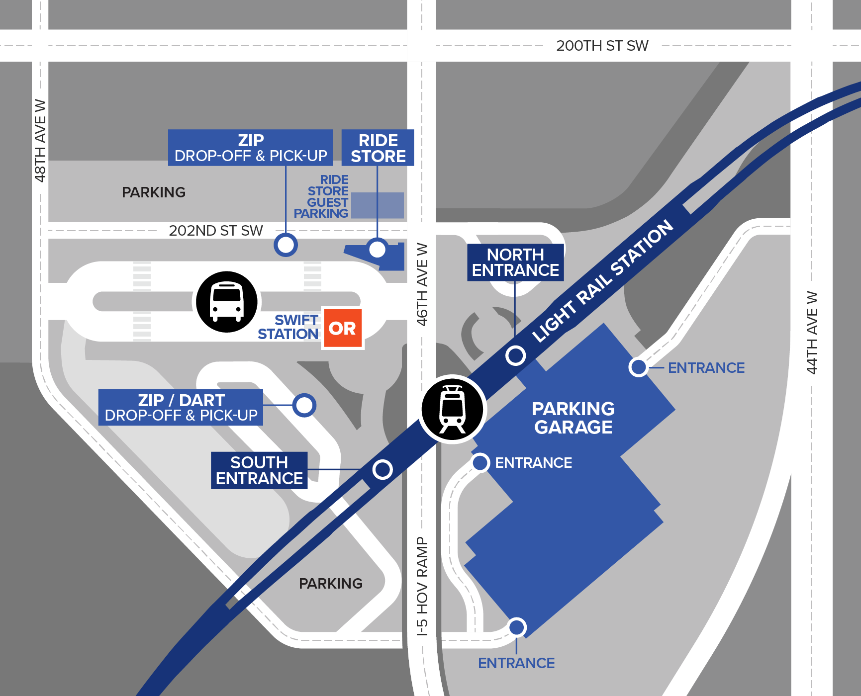The Lynnwood Link Extension brings light rail to Snohomish County! Customers can ride Zip Shuttle Alderwood to Lynnwood City Center Station to connect to light rail.
